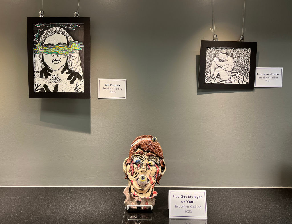 Brooklyn Collins is a junior majoring in studio art and graphic design with a minor in communications. Originally a native of Crown City, Ohio, Collins' family now resides in Thomasville, NC. Collins has always had a creative spirit and cherishes art for its ability to capture memory. In her words, "Materialistic things can wither but memories last forever." She states that people are creative in their own ways and plans to continue her creative journey after graduation in her pursuit of a career in animation. Brooklyn describes her artistic style as random and takes inspiration from manga art and horror films. In many of her works, she includes eyeballs and swirls and opts for a black and white color scheme for the allusion of drama.