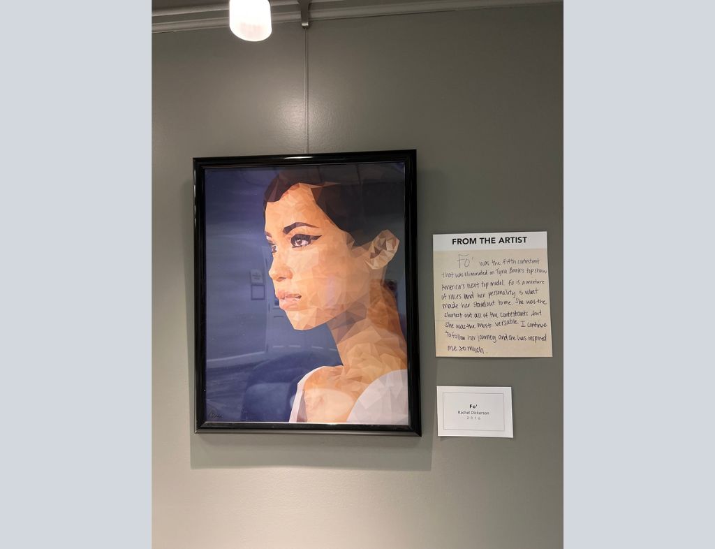 Rachel's exhibit showcased work from her time at Campbell, including pieces from her Senior Showcase. Much of her work depicts people of color and women, both of whom Rachel identifies as. Her self-identity is a major inspiration for her work. Of her triangle-motif "Artists of Color" piece, Rachel says the combination of different shades of brown represents the unity of minority groups during the push for Diversity, Equity and Inclusion of recent years; the paint brushes symbolize Rachel the artist. This work was created in 2016 for a club within the UNC School of Art and is still in use today. "FKA Twigs" and "Fo'" depict women of color who challenge the world around them, breaking barriers and courageously standing up for themselves. Showcasing women who inspired her in her work, Rachel hopes to inspire others, and to see more women as subjects in the print art medium.